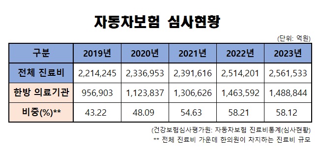 반대로 자동차보험 진료비 영역으로 넘어오면 상황은 역전된다. 심평원의 ‘자동차보험 진료비통계’에 따르면 자보 진료비는 지난 2019년 9,569억원에서 2023년 1조4,888억원으로 꾸준히 늘었다. 증가율은 55.59%였다. 전체 자보 진료비 가운데 한방 진료비가 차지하는 비율은 58.13%로 절반을 넘겼다.