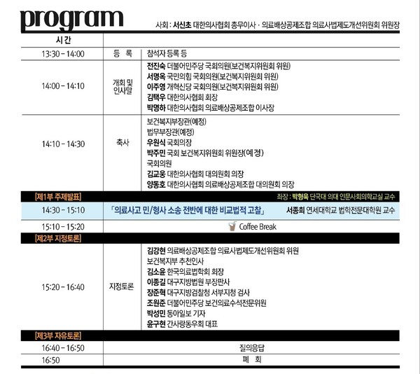 지정 토론은 의료계에서 공제조합 김강현 의료사법제도개선위원과 한국의료법학회 김소윤 회장이 참여한다. 법조계에서는 대구지방법원 이종길 부장판사와 대구지방검찰청 서부지청 장준혁 검사가 나선다. 이어서 민주당 조원준 보건의료수석전문위원과 간사랑동우회 윤구현 대표가 발언한다.