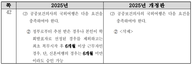 개정안은 해당 조항을 삭제해 공보의가 국외여행을 위해 일정기간을 채워야 한다는 단서를 삭제했다.
