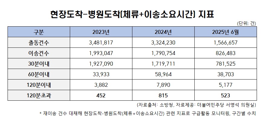 응급환자가 병원 도착까지 소요되는 시간(체류와 이송 포함)도 증가 추세다. 소방청 자료에 따르면 2023년 전체 이송 179만건 중 병원 도착까지 30분을 초과한 사례는 1.9%에 불과했으나, 2024년 3.8%, 올해 상반기 5.4%로 3년간 3배 가까이 늘었다. 특히 지난해 구급대원이 현장에 도착한 후 환자가 병원에 도착하는데 걸린 시간이 120분을 초과한 사례는 전년 대비 80.3% 늘었다.