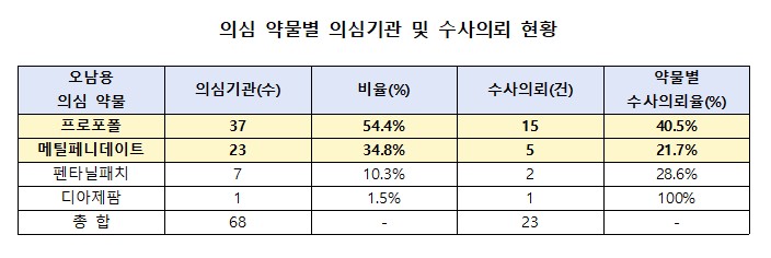 주요 의심 약물별 수사의뢰 현황은 ▲프로포폴 사용 의심기관 37개소에서 15건(40.5%) ▲메틸페니데이트 사용 의심기관 23개소에서 5건(21.7%) ▲펜타닐패치 사용 의심기관 7개소에서 2건(28.6%) ▲디아제팜 사용 의심기관 1개소에서 1건(100%)으로 나타났다.