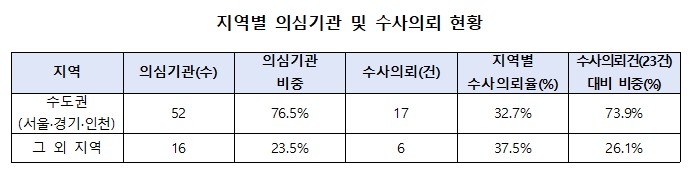 지역별로는 서울·경기·인천 수도권이 전체 의심기관의 76.5%를 차지했으며 ▲서울지역 사용 의심기관 30개소에서 10건 ▲경기지역 사용 의심기관 18개소에서 5건 ▲인천지역 사용 의심기관 4개소에서 2건이 수사의뢰 됐다.