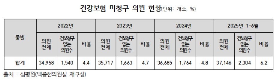 백 의원에 따르면 2025년 상반기 기준 건강보험 진료비 청구가 단 한 건도 없는 의원급 의료기관은 2,304곳으로, 이는 지난 2022년 1,540곳에서 약 50% 증가한 수치다.